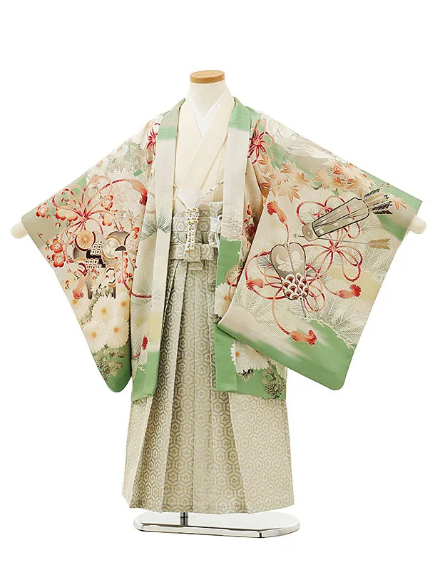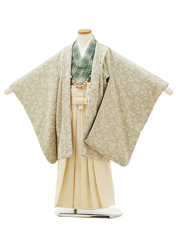 七五三レンタル(5歳男袴)X199グリーンベージュ小花xアイボリー袴