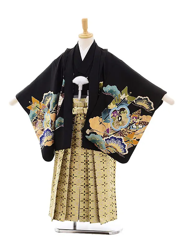 七五三(5.6歳男袴)5416 黒地 松 矢羽根 鷹×ベージュゴールド袴