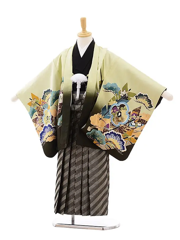七五三レンタル(5歳男袴)5919【高級正絹】抹茶色ぼかし丸紋x紺細縞袴