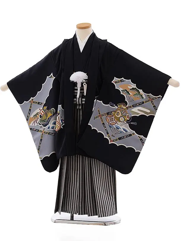 七五三(5歳男児袴)5473 (高級正絹) 黒地 かすみにかぶと×黒白縞袴