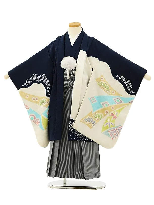 七五三レンタル(5歳男袴)5914【高級正絹】紺地雲取り吉祥文様x紺細縞袴