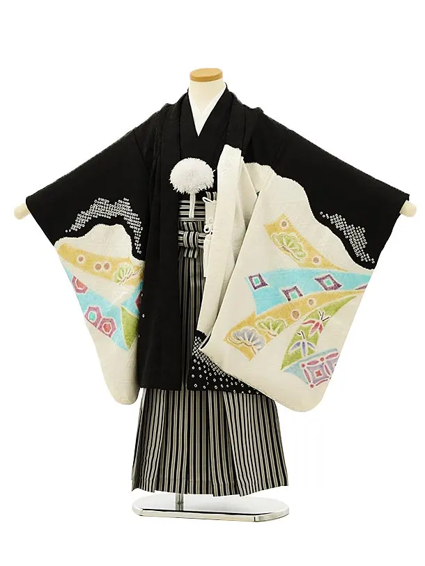 七五三(5歳男袴)5380 (正絹)黒地 絞り 小槌 鷹 刺しゅう ×黒縞袴