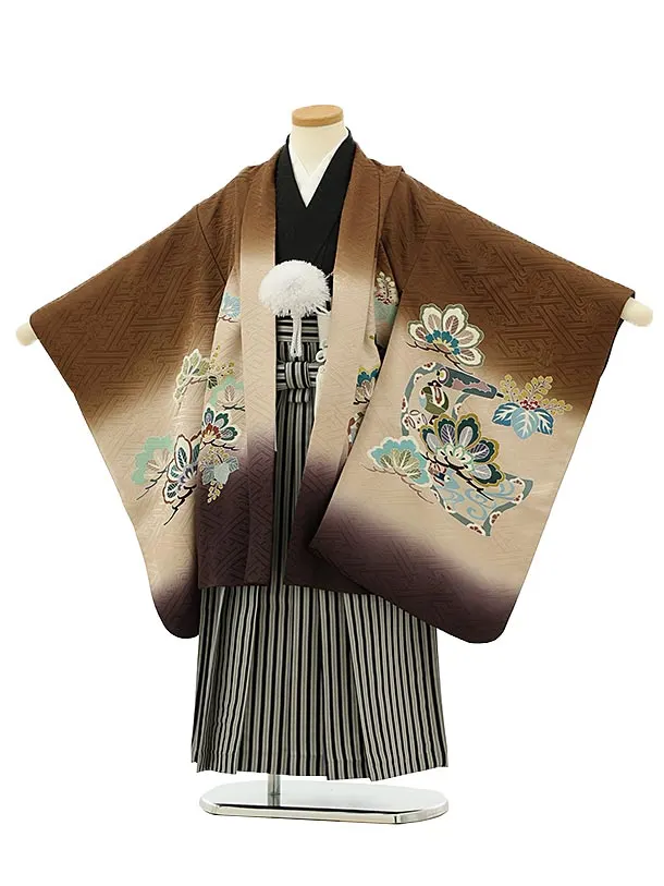 七五三レンタル(5歳男袴)5927【高級正絹】茶色ぼかし松に吉祥巻物x黒縞袴