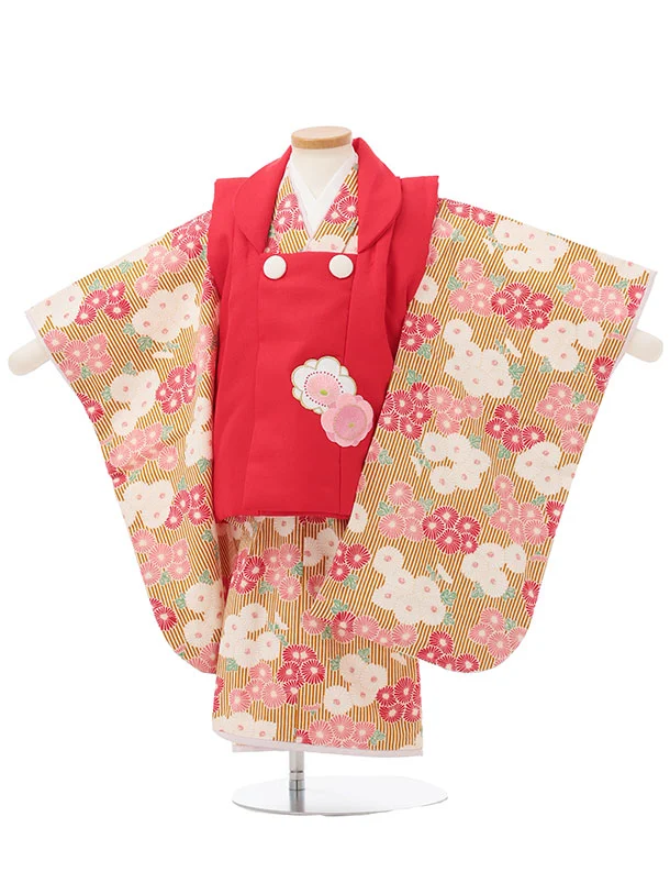 七五三レンタル(3歳女児被布)S158 赤×からし色 ストライプ菊