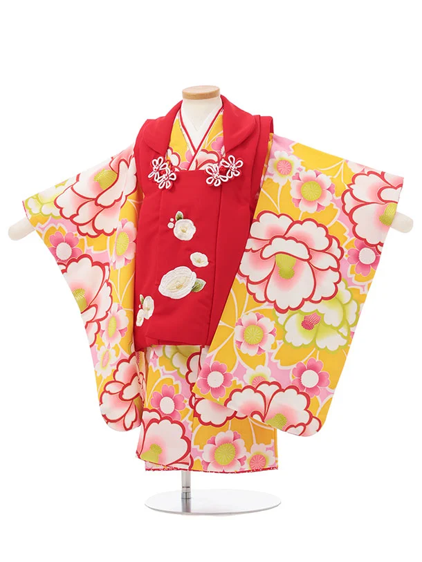 七五三レンタル(3歳女児被布)S159 赤 刺繍 椿×黄色 桜 椿