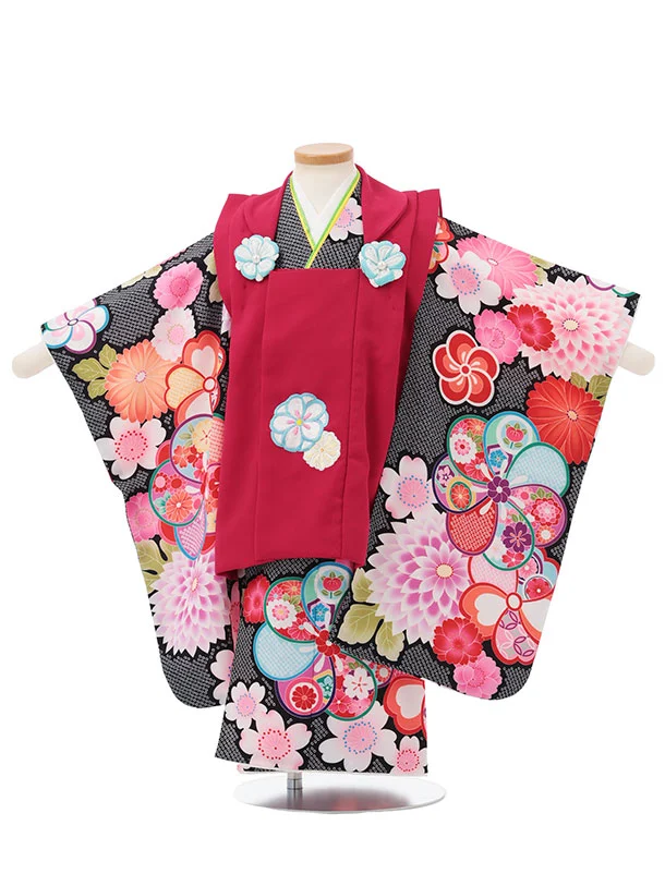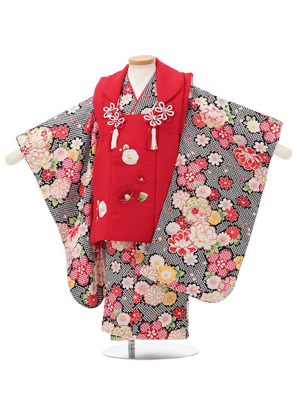 七五三レンタル(3歳女児被布)S168 黒地 菊×赤ちりめん