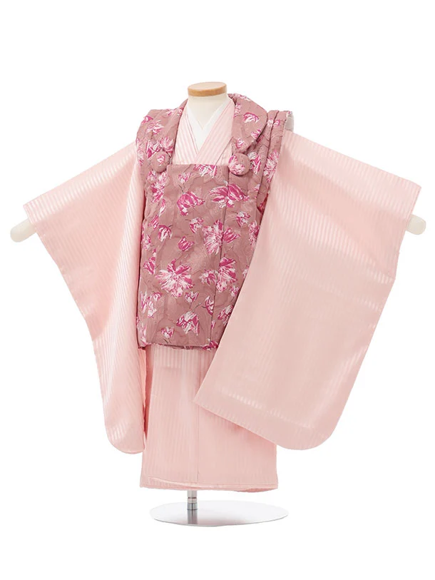 七五三レンタル(3歳女児被布)S163 くすみピンク 花×ピンクストライプ