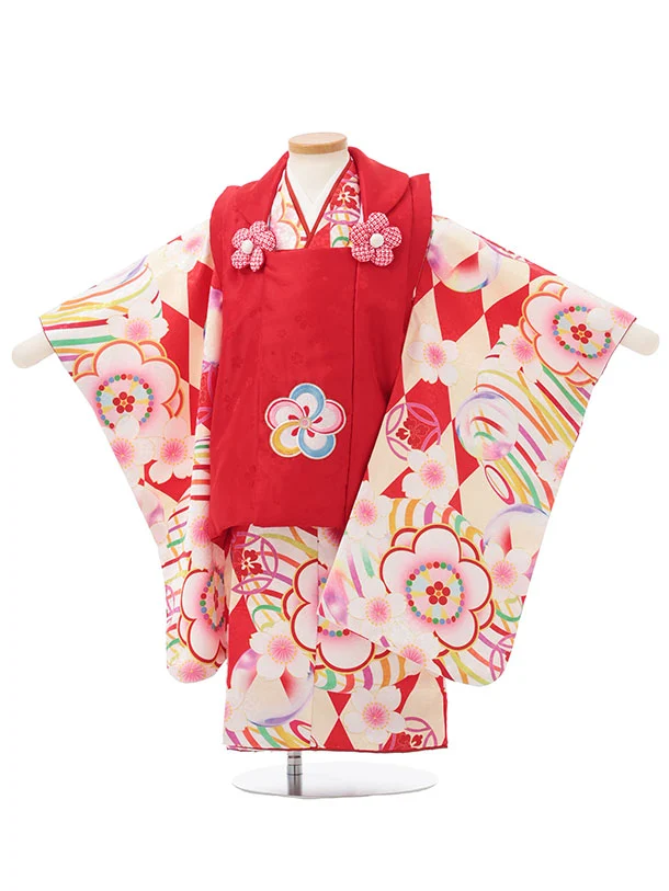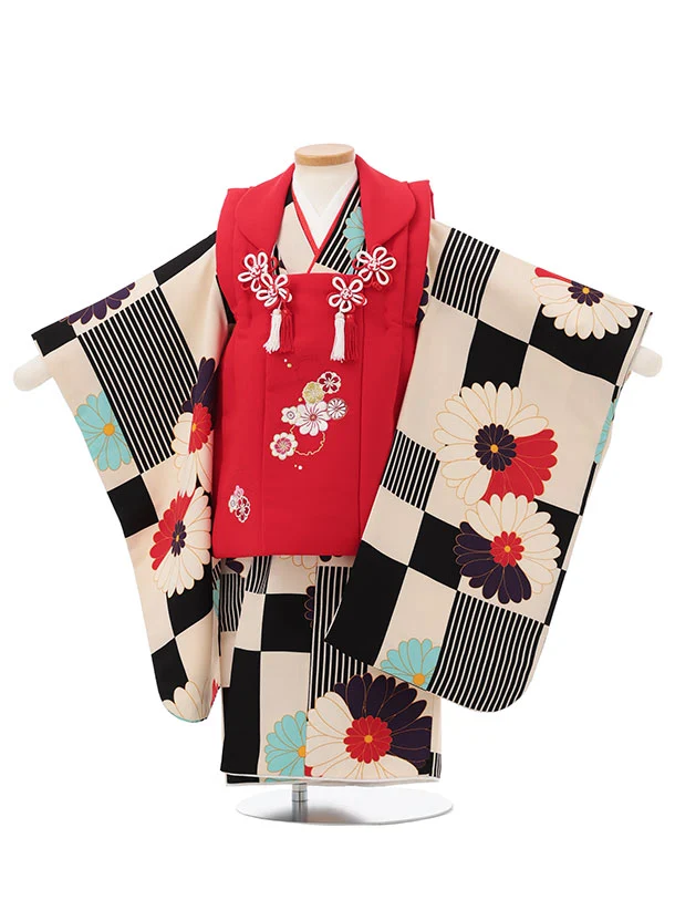 七五三レンタル(3歳女児被布)S164 赤 刺繍雪輪×クリーム 市松 菊