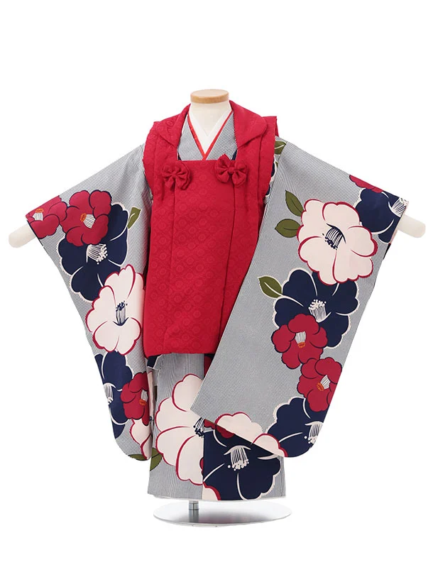 七五三レンタル(3歳女児被布)S165 赤×ブルーストライプ椿