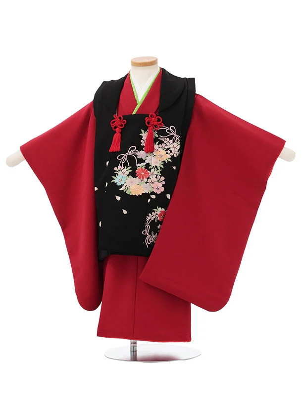 七五三レンタル(3歳女児被布)S160 赤 刺繍 椿×黒地 花