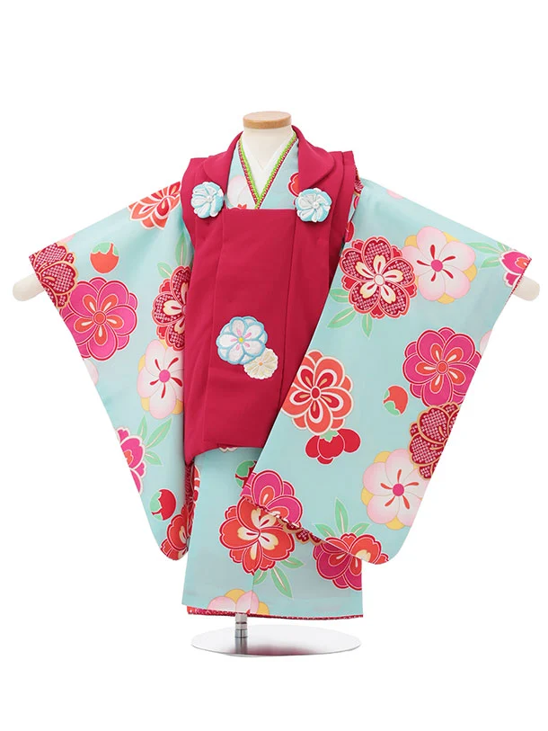 七五三レンタル(3歳女児被布)S167 赤 ねじり梅×水色 梅