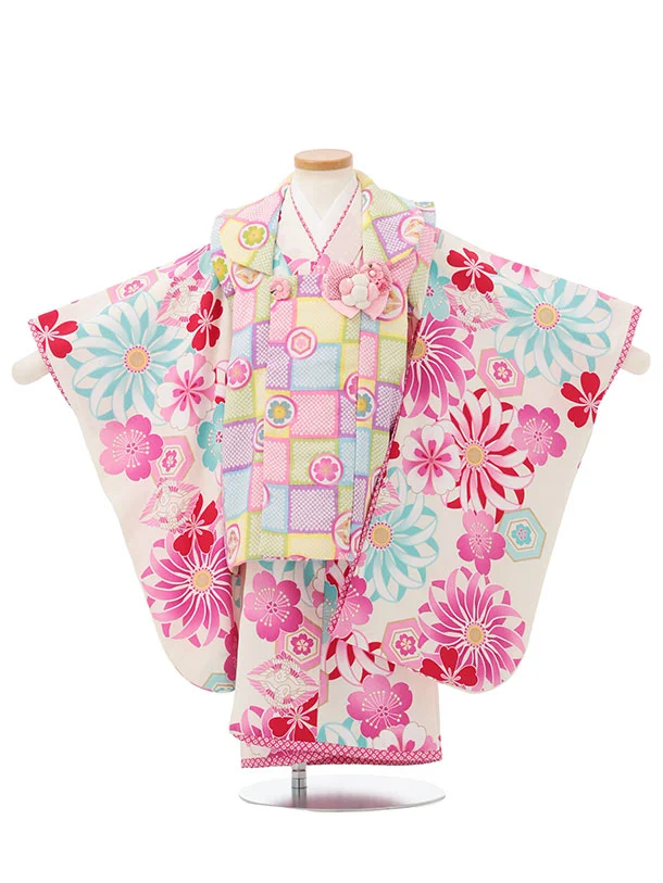 七五三レンタル(3歳女児被布)S175 カラフル丸紋×白地 菊桜