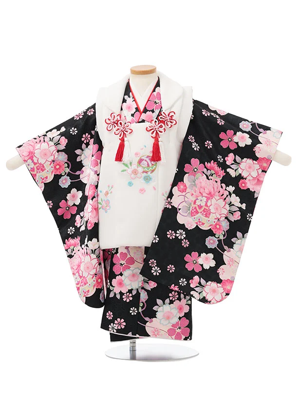 七五三レンタル(3歳女児被布)S177 白 刺繍 桜 まり×黒地 まり 花
