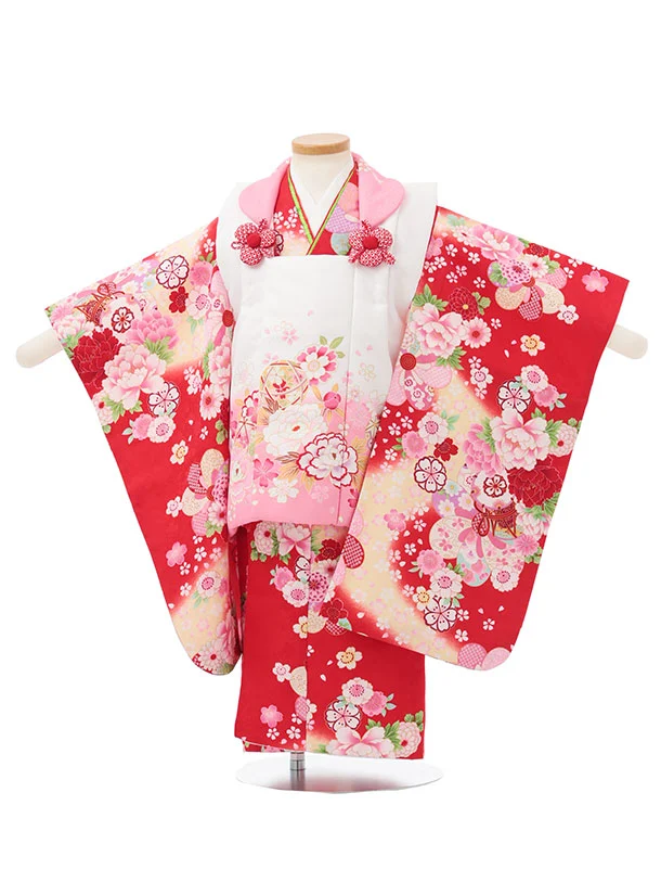 七五三レンタル(3歳女児被布)S156 赤白×赤 牡丹 桜