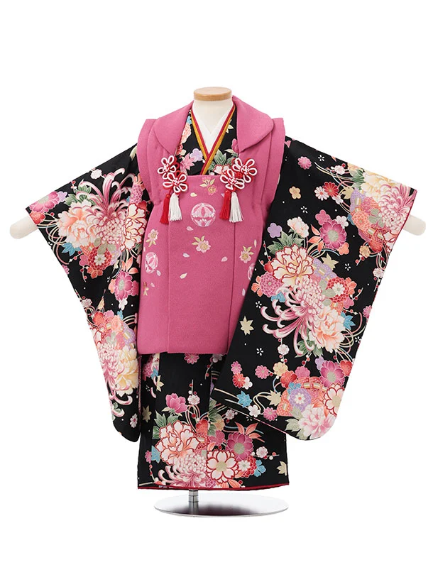 七五三レンタル(3歳女児被布)S183 ローズピンク×黒地 鹿の子 ねじり梅
