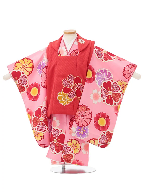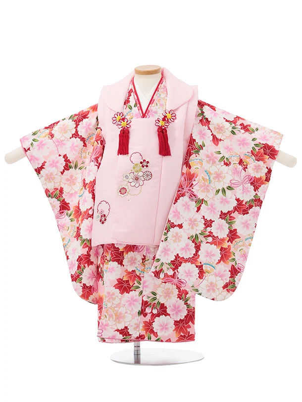 七五三レンタル(3歳女児被布)S185 朱赤×ピンク 桜 菊
