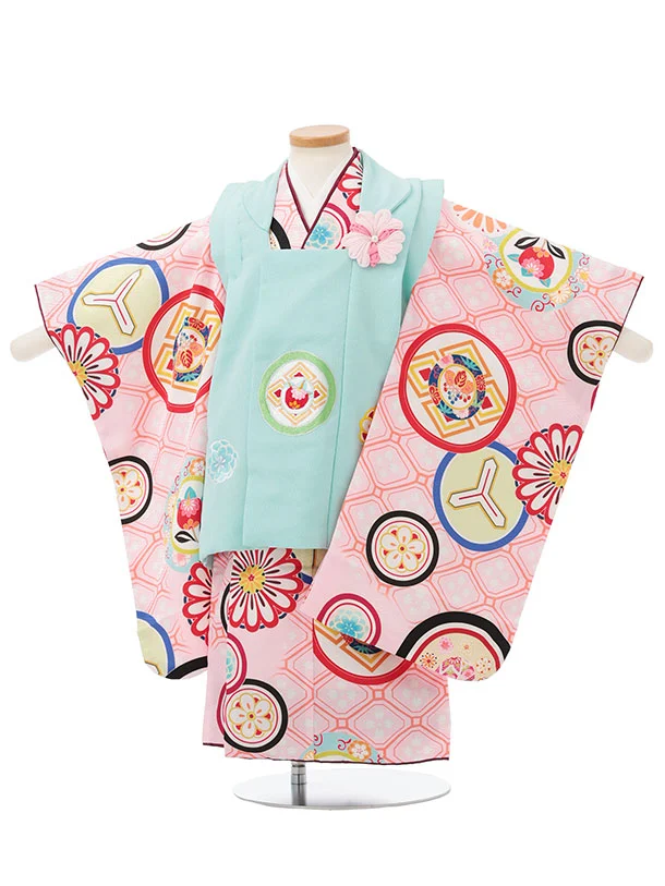 七五三レンタル(3歳女児被布)S186 水色×ピンク丸紋