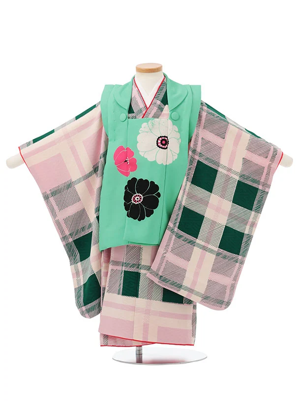 七五三レンタル(3歳女児被布)S187 グリーン×ピンクチェック