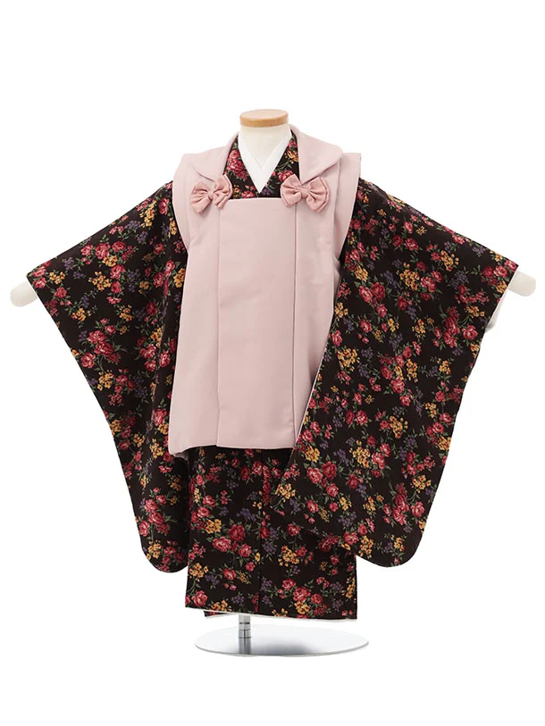 七五三レンタル(3歳女児被布)S181 ピンクぼかし花×黒地 鹿の子 ねじり梅