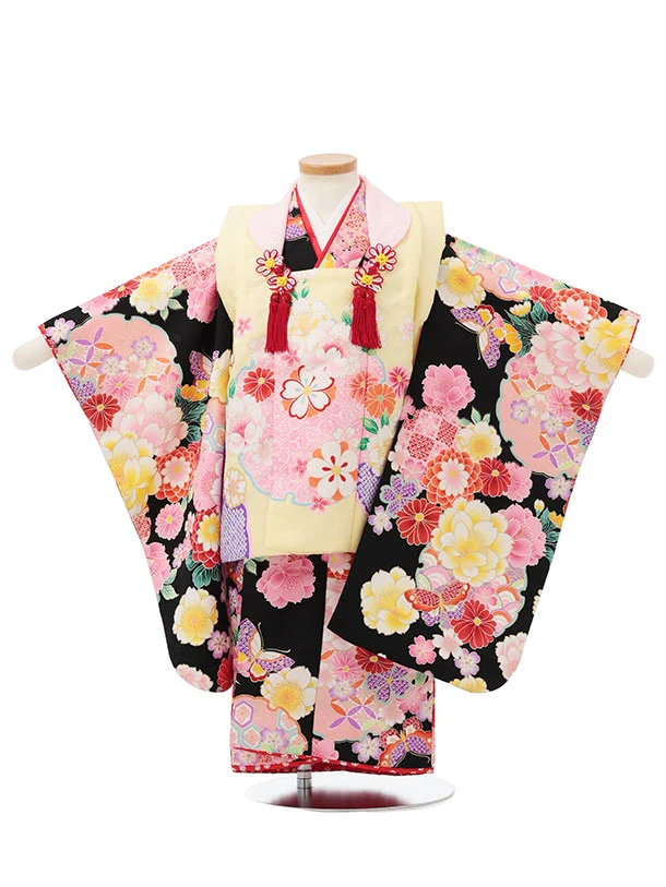 七五三レンタル(3歳女児被布)S195 うす黄色 雪輪花×黒地 花蝶