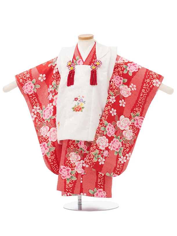七五三レンタル(3歳女児被布)S199 白×赤地 牡丹 桜