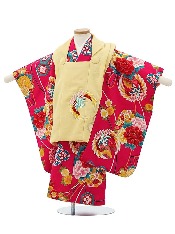 七五三レンタル(3歳女児被布)4218花わらべ 薄黄色刺繍鶴×ピンク鶴薬玉