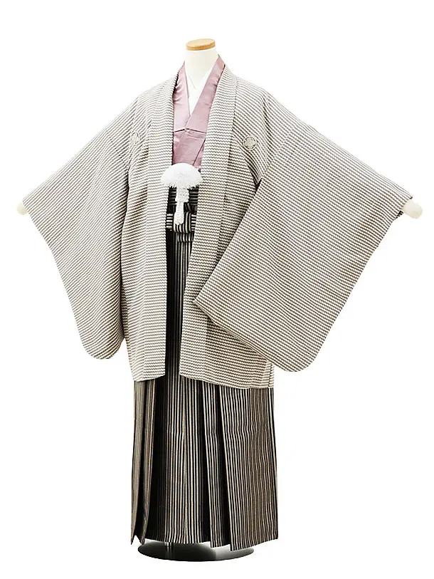 小学生男児袴レンタルZ308花わらべベージュストライプ×グレージュ縞