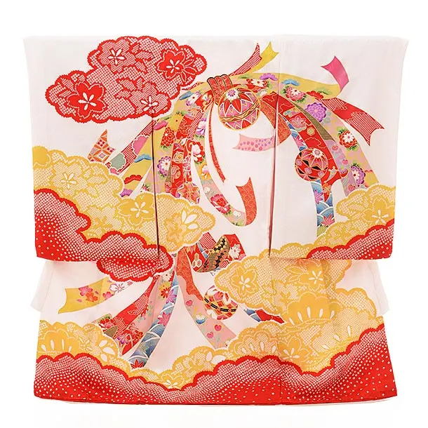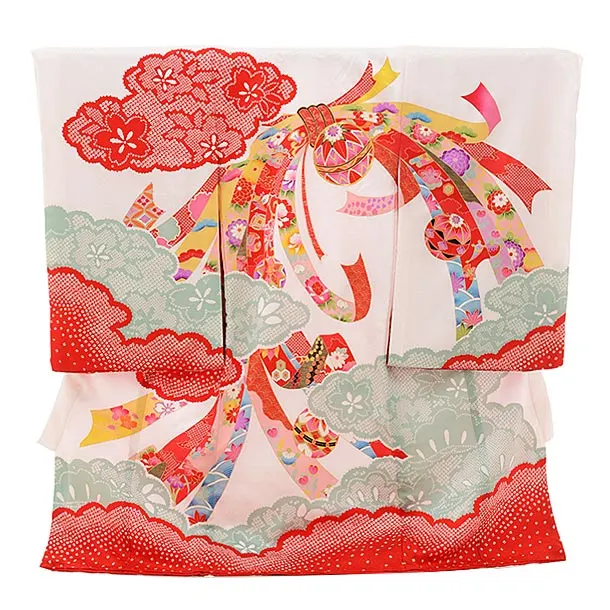 女児産着 お宮参りレンタル1705 正絹 白地赤 雲取り 束ねのしにまり