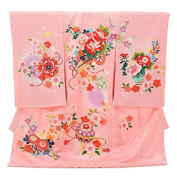 女児産着 お宮参りレンタル1691 正絹 ピンク地 花車にまり