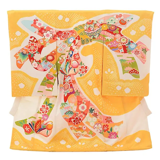 女児産着 お宮参りレンタル1697 高級正絹【百貫達夫】黄色束ね熨斗におしどり
