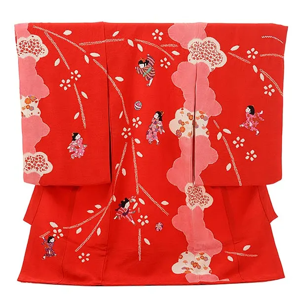 女児産着 お宮参りレンタル1706 正絹 赤地 梅に童べ