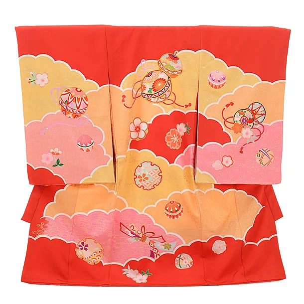 女児産着 お宮参りレンタル1714 正絹 赤地 雲取り まり
