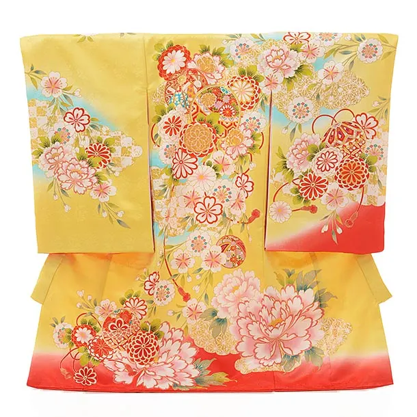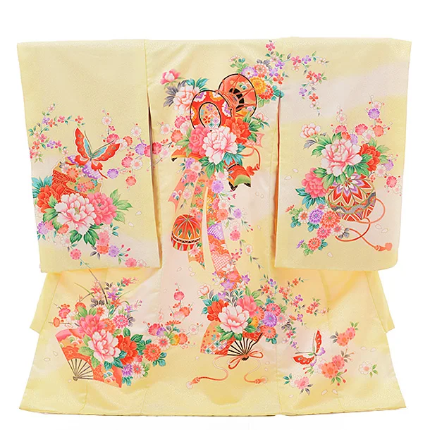女児産着 お宮参りレンタル1813 京友禅 黄色地 桜ぼたんまり