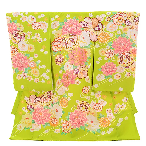 女児産着 お宮参り レンタル 1259 ライムグリーン地 まり ぼたん