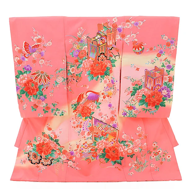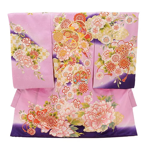 女児産着 お宮参り レンタル 1260 ピンクぼかし 御所車にぼたん