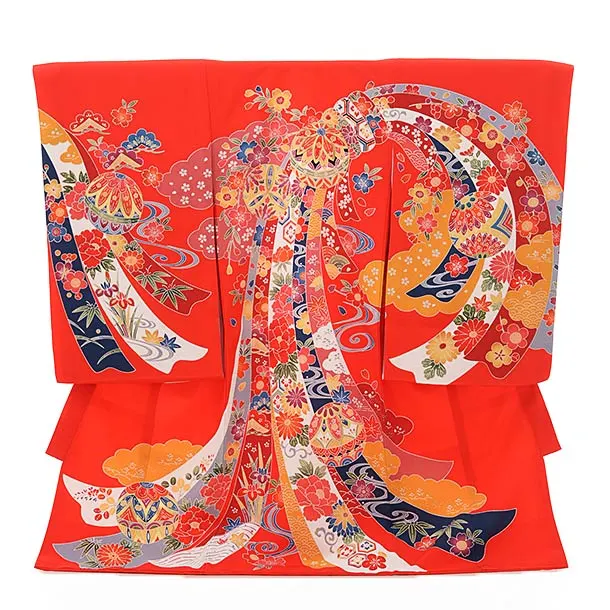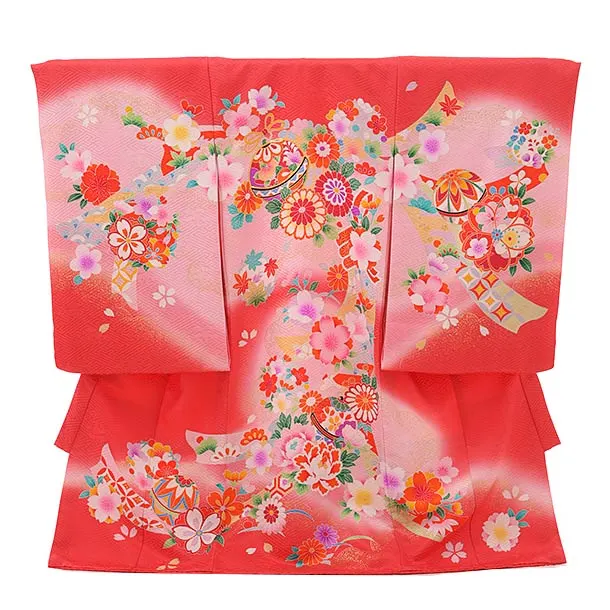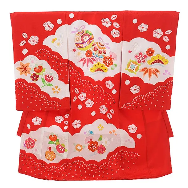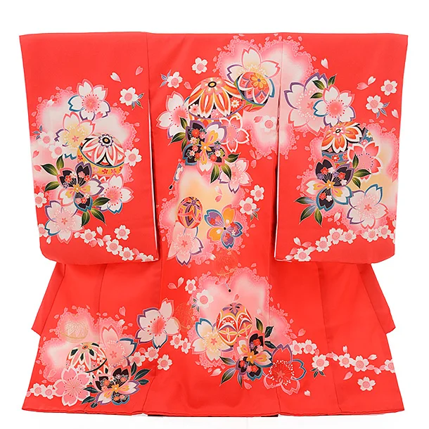 女児産着 お宮参りレンタル1824 赤地 まり 鈴 桜
