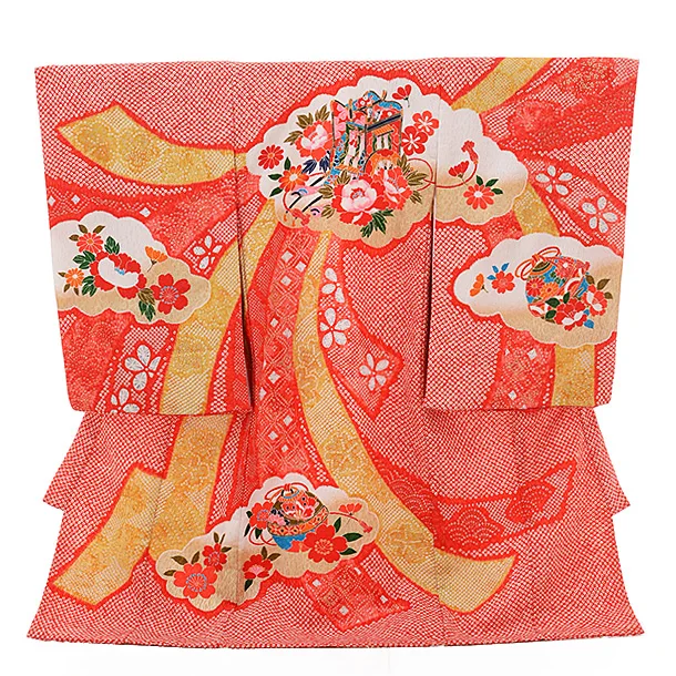 女児産着 お宮参りレンタル1819 オレンジ地 雲取り 花車