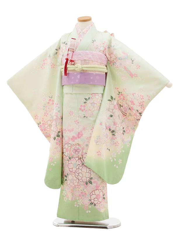 七五三(7歳結び帯)Y599 薄ミント 裾パープル 丸紋 桜