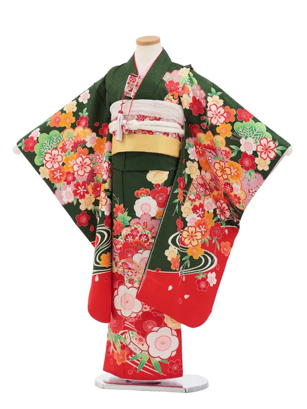 七五三(7歳結び帯)Y654 グリーン裾赤 流水貝桶に梅
