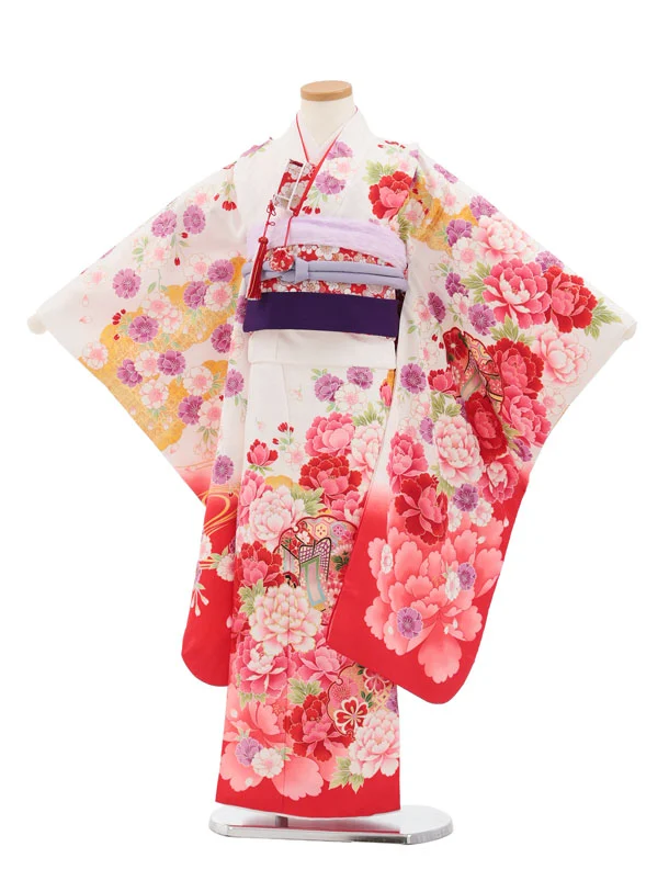 七五三(7歳結び帯)Y655 白地裾赤 雪輪に牡丹桜