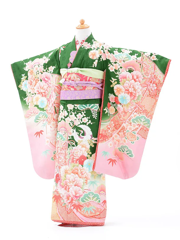 753レンタル(7歳女結び帯)7125 グリーンピンクぼ