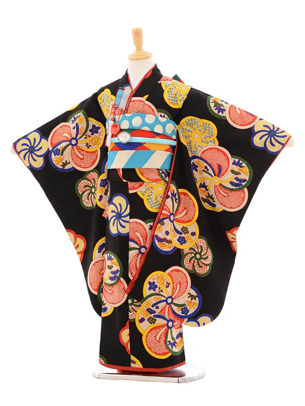 七五三レンタル(7歳女の子結び帯)7638 JAPAN STYLE 黒赤 ぼたん