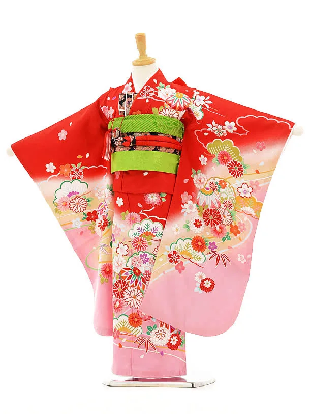 753レンタル(7歳女結び帯)7126 赤地ピンクぼ