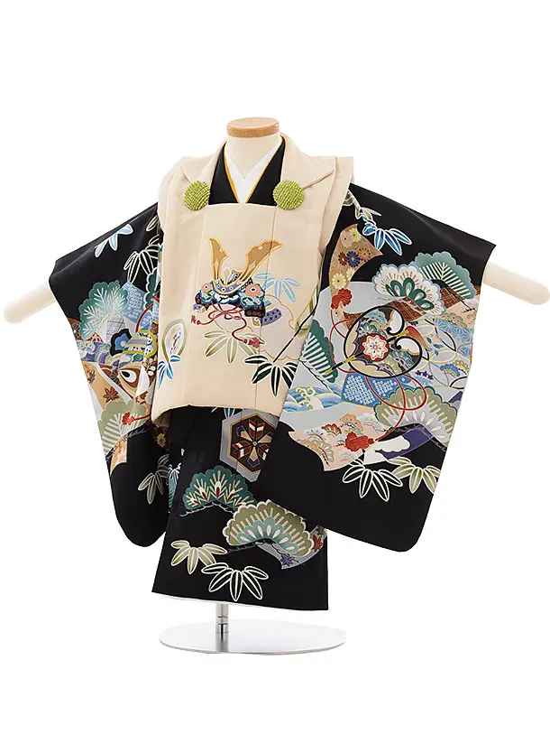 七五三レンタル(2歳男児被布)2612ベージュ地かぶとx黒地吉祥文様