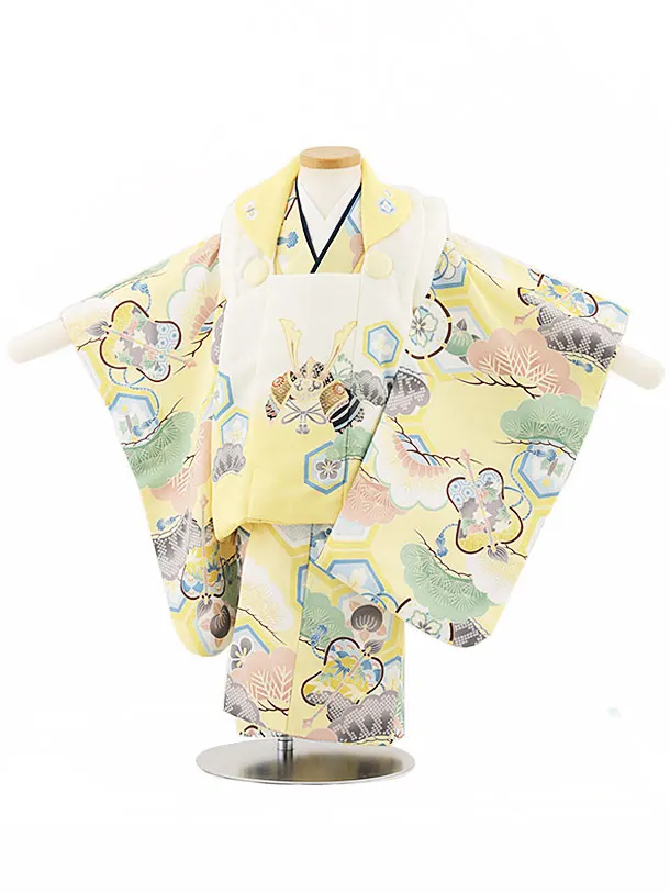 七五三レンタル(2歳男児被布)W507 白黄に兜×亀甲紋に松
