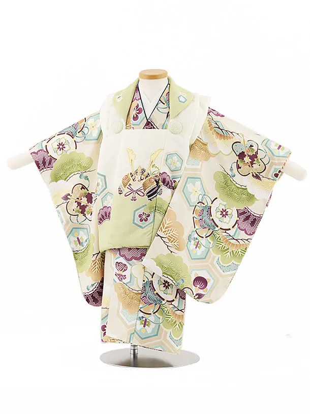 七五三レンタル(2歳男児被布)W502 ベージュ犬張り子×緑パープルぼかし松竹梅