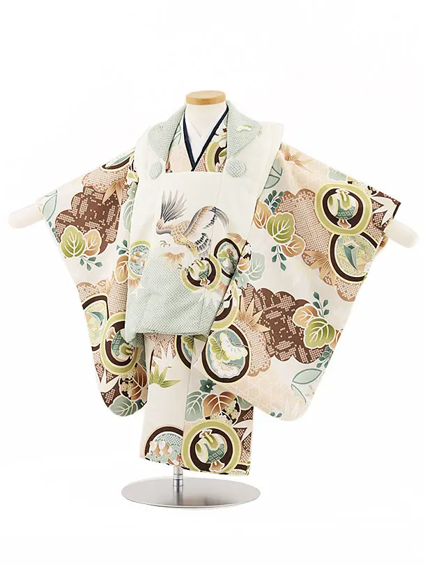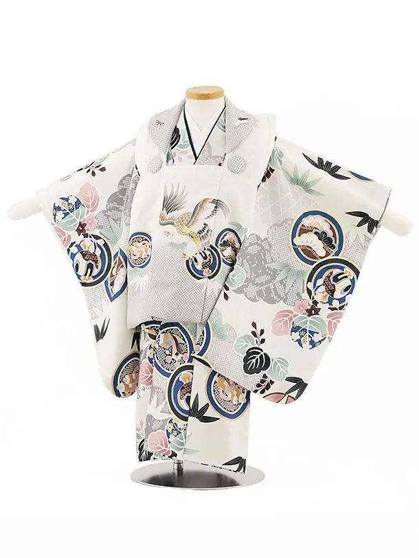 七五三レンタル(2歳男児被布)W508 白グレー鷹×アイボリー雲取りに丸紋