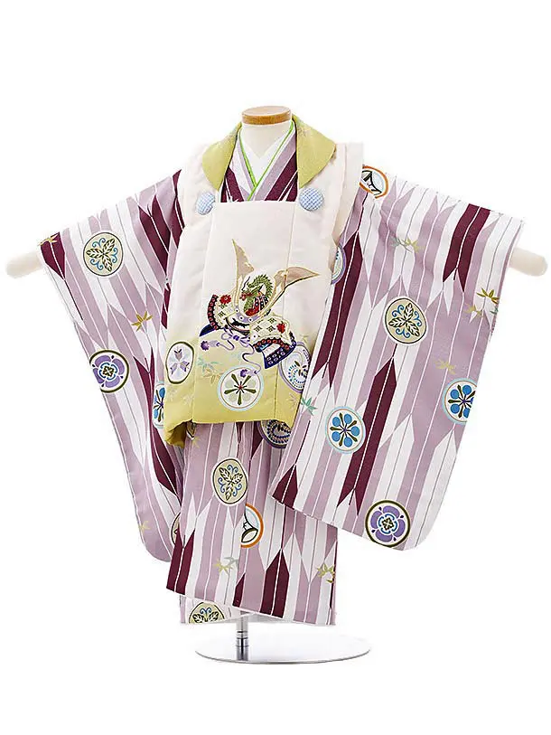七五三レンタル(2歳男児被布)2694クリームぼかし丸紋兜xパープル矢柄丸紋