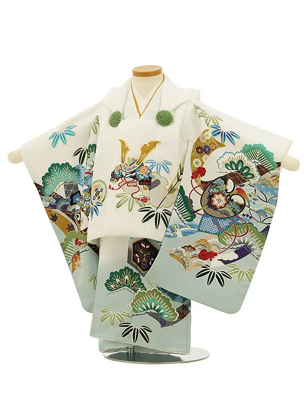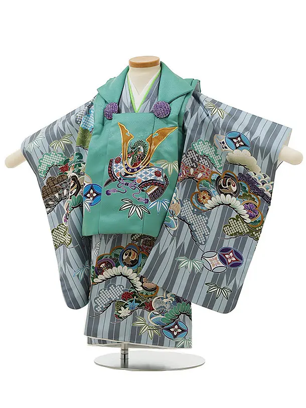 七五三レンタル(2歳男児被布)2973グリーン兜×グレー矢柄吉祥文様