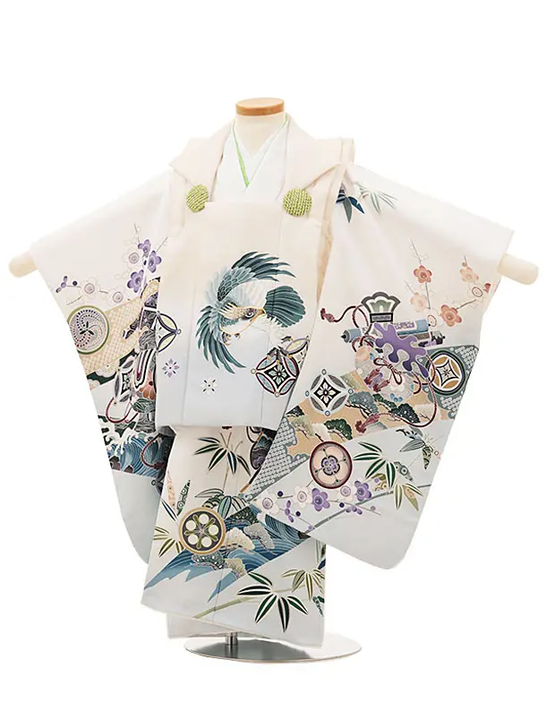 七五三レンタル(2歳男児被布)W508 白グレー鷹×アイボリー雲取りに丸紋